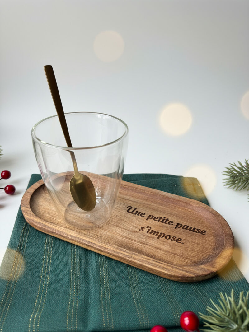 🪵 Un plateau en bois gravé, personnalisable avec un prénom, un mot doux ou une date — un geste attentionné et unique.